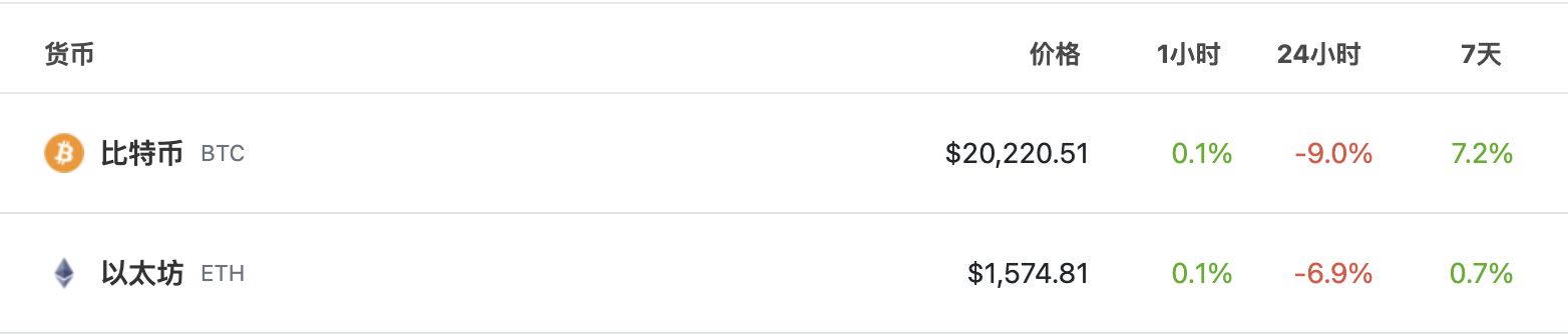 据 CoinGecko 行情动态显示，从昨晚起，BTC 和 ETH 分别经历了不同程度的下跌，24h 跌幅分别为 9.1% 和 7.0%。BTC 跌破 $21,000，现报价 $20,220.51；ETH 跌破 $1,600，现报价 $1,574.81。