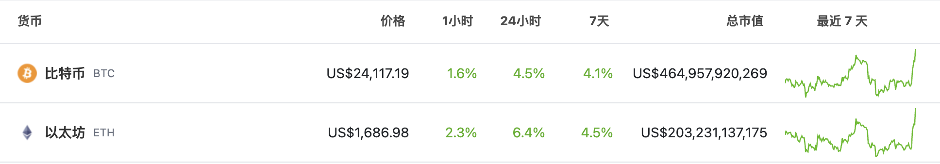 据 CoinGecko 行情动态显示，BTC 和 ETH 在 24h 内涨幅分别为 4.5% 和 6.4%，BTC 突破 $24,000，现报价 $24,117.19；ETH 突破 $1,650，现报价 $1,686.98。Tokenlon 在此温馨提醒：行情波动较大，请注意风险控制。
