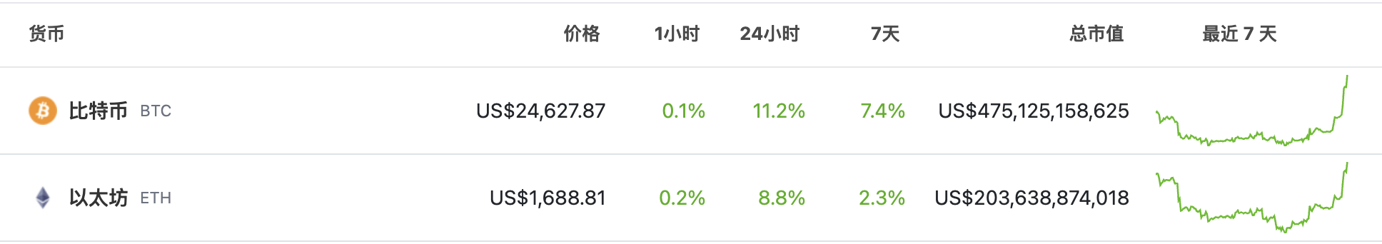 据 CoinGecko 行情动态显示，BTC 突破 $24,000，最高涨至 $24,737.24，24h 涨幅达 11.2%，现报价 $24627.87。ETH 同样涨势凶猛，24h 涨幅达 8.8%，突破 $1,600，现报价 $1,688.81。