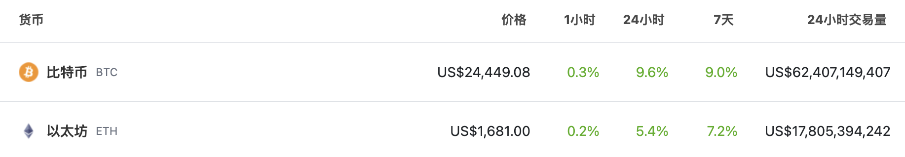 据 CoinGecko 行情动态显示，市场普涨态势继续延续，BTC 突破 $24,000，现报价 $24,449.08，24h 涨幅近 10%。ETH 同样保持增长态势，24h 涨幅为 5.4%，现报价 $1,681。Tokenlon 在此温馨提醒：行情波动较大，请注意风险控制。
