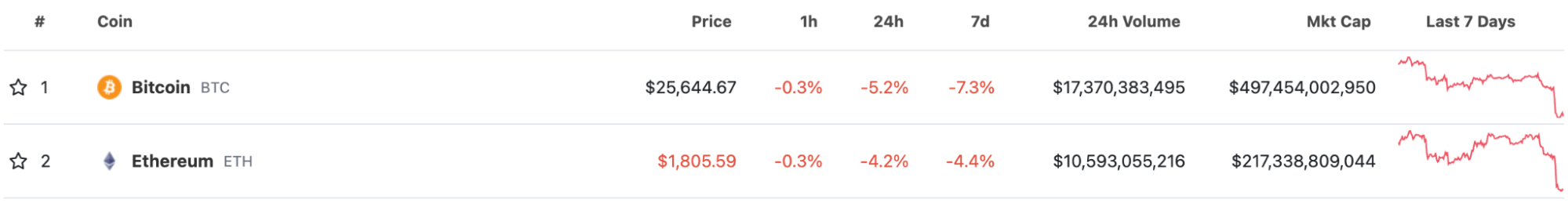 受 SEC 起诉币安影响,据 CoinGecko 行情动态显示,BTC 和 ETH 在 24h 内跌幅分别为 4.2% 和 5.2%,BTC 跌至 $25,443.92,现报价 $25,644.67;ETH 跌至 $1,794.14,现报价 $1,805.61。