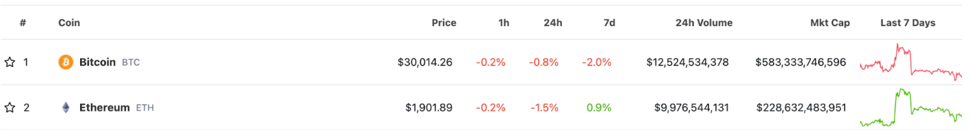 据 CoinGecko 行情动态显示，**BTC 跌破 $30,000，最低跌至$29,792.92**，现在报价 $30,014.26；**ETH 跌破 $1,900，最低跌至 $1,883.08**，现在报价 $1,901.89 。Tokenlon 在此温馨提醒：行情波动较大，请注意风险控制。