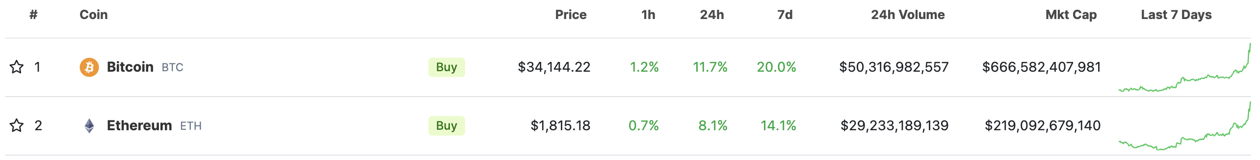 据 CoinGecko 行情显示，BTC 年内新高，短时突破 $35,000，现在报价 $34,144.22；ETH 现在报价 $1,815.18 ；24h 涨幅分别为 11.7% 和 8.1%。