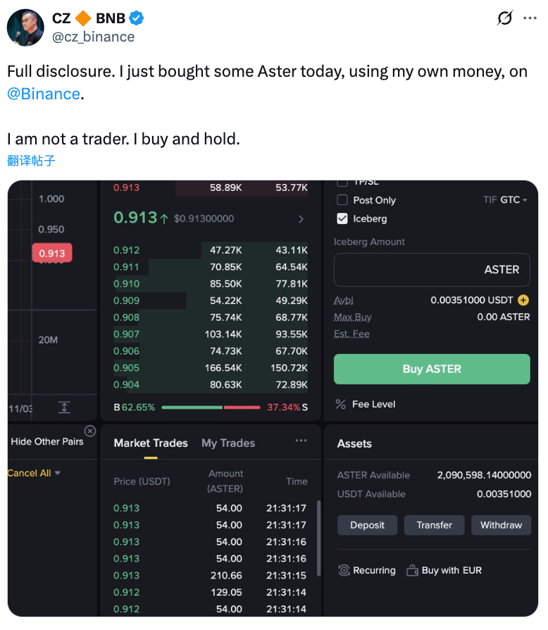 Binance 创始人 CZ 发推称：「今天刚在 Binance 用自己的钱买了一些 ASTER。我不是交易员，我买入并持有。」