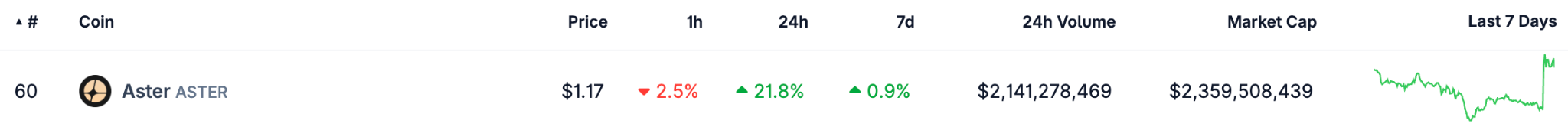 从其发布的交易截图可见，账户持有 2,090,598.14 枚 ASTER，买入价约 $0.913。受此消息带动，**ASTER 现报 $1.17，24 小时上涨 21.8%。**