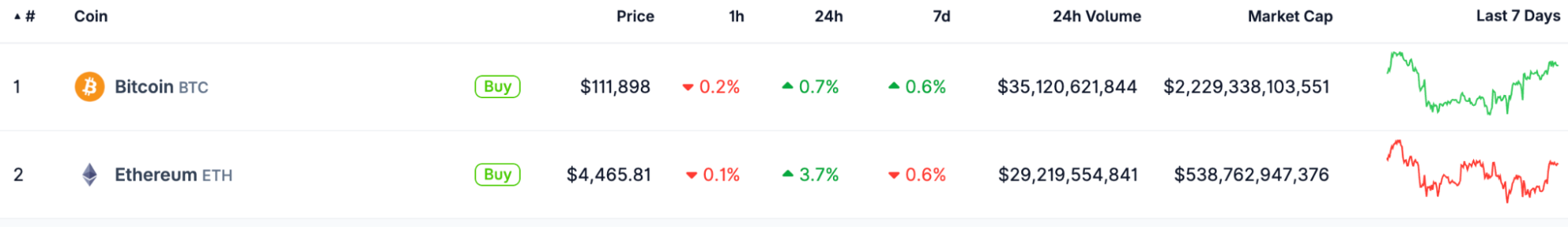 The cryptocurrency market continues to fluctuate, with major tokens like Ethereum bouncing significantly. Based on CoinGecko market data, ETH has reclaimed $4,400, now at $4,465.81, up 3.7% in 24h. BTC is now at $111,898, up 0.7% in 24h.