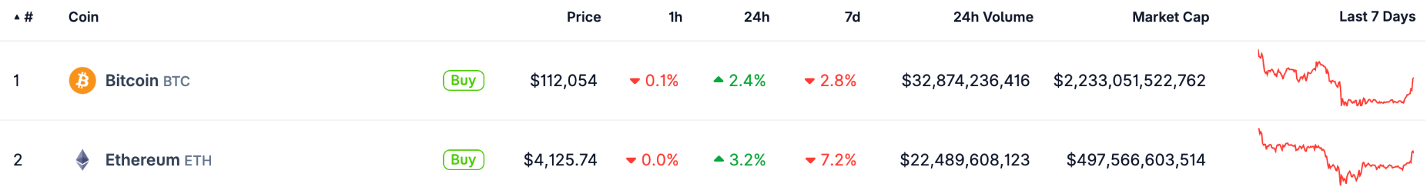 The cryptocurrency market bounced over the weekend. Based on CoinGecko market data, ETH returned above $4,100, now at $4,125.74, up 3.2% in 24h. BTC is now at $112,054, up 2.4% in 24h.