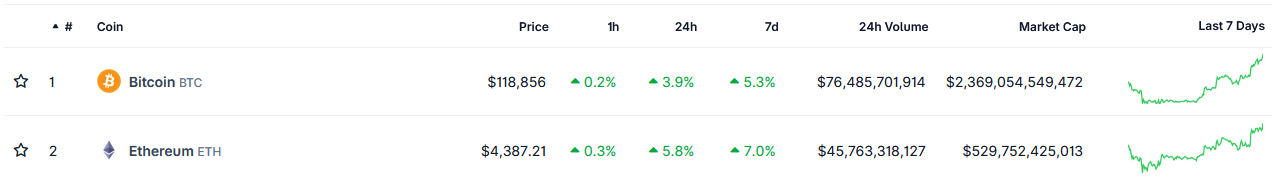 The cryptocurrency market continues to rise. Based on CoinGecko market data, ETH is now at $4,387.21, up 5.8% in 24h. BTC is now at $118,856, up 3.9% in 24h.