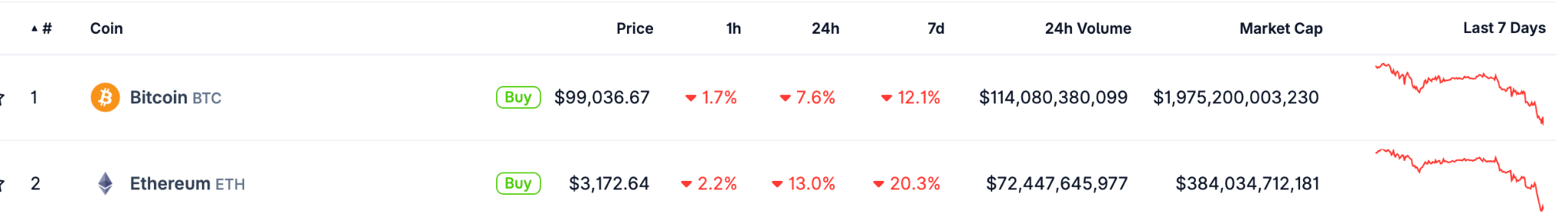 $750 billion was wiped out from the US stock market yesterday, and the cryptocurrency market continues to fall. BTC fell below $100,000, and ETH fell below $3,200. Based on CoinGecko market data, BTC is now at $99,036.67, down 7.6% in 24h. ETH is now at $3,172.64, down 13% in 24h.