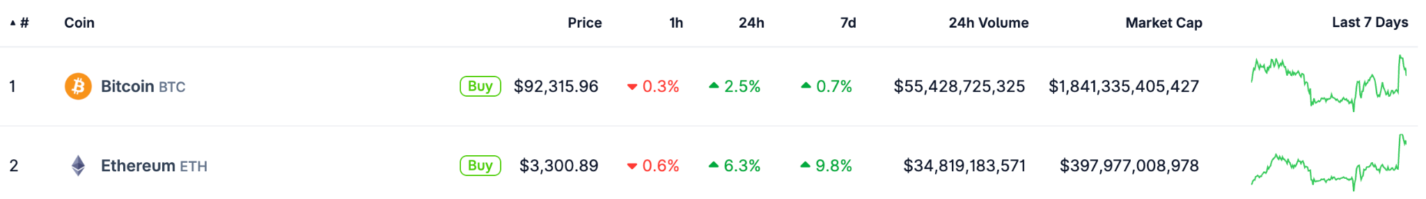 Based on CoinGecko market data, ETH is now at $3,300.89, up 6.3% in 24h. BTC is now at $92,315.96, up 2.5% in 24h.&#x20;